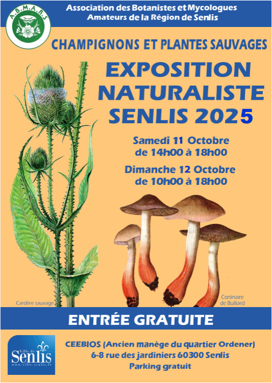 L'Association des Botanistes et Mycologues Amateurs de la Région de Senlis (ABMARS) organise son exposition 2025 au Manège Ordener à Senlis. L'exposition est à propos de champignons, de plantes sauvages et sera un salon de la Nature.