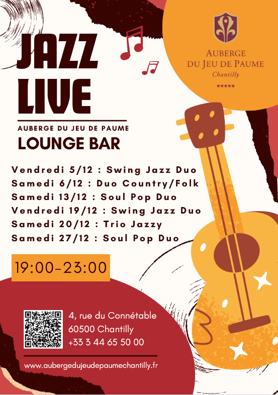 Le lounge bar de l'Auberge du Jeu de Paume 5* - Relais & Château à Chantilly, vous propose régulièrement des soirées "live sessions Jazz".