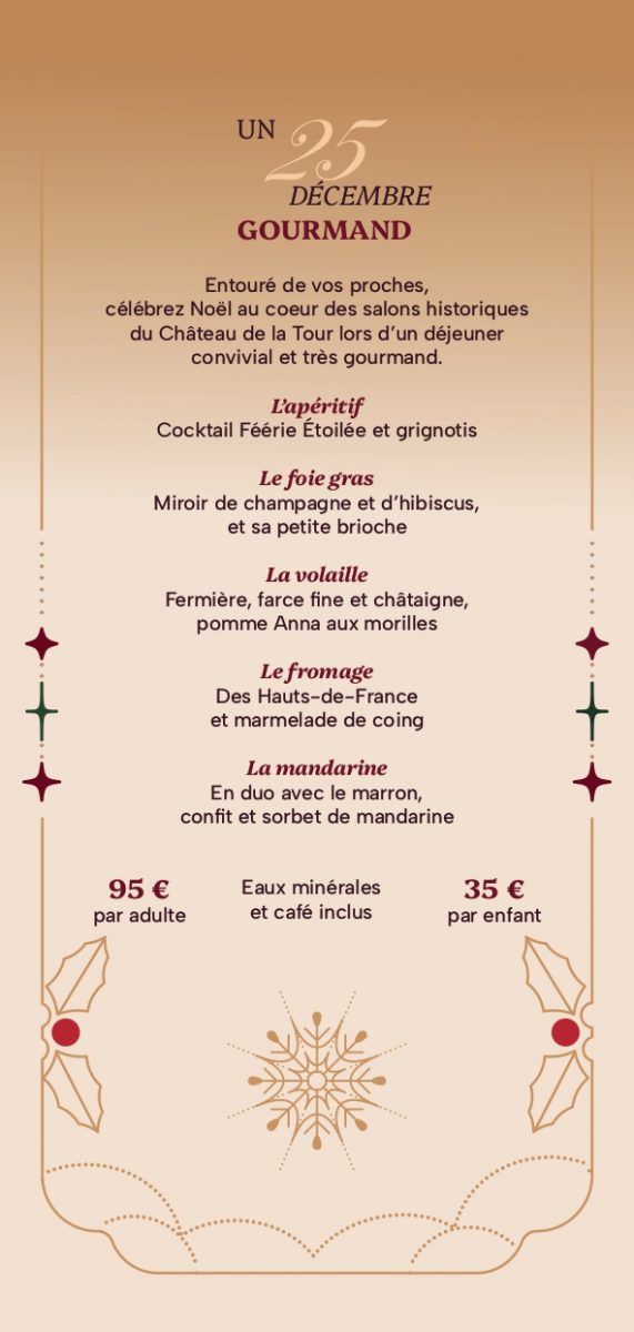 Entouré de vos proches, célébrez Noël au cœur des salons historiques du Château de la Tour lors d’un déjeuner convivial et très gourmand.