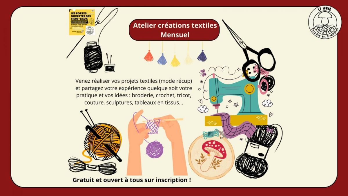 Samedi 4 octobre septembre de 10h à 14h, venez réaliser vos projets textiles (mode récup) et partagez votre expérience quelque soit votre pratique et vos idées : broderie, crochet, tricot, couture, sculptures, tableaux en tissus…