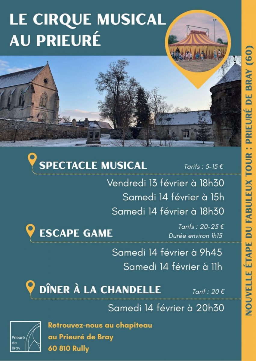 A l'issue d'un mois de résidence artistique au Prieuré de Bray, le chapiteau du Cirque Musical ouvre ses portes au public les 13 et 14 février 2026. Avant un grand tour de France de 6 mois, la troupe vous invite à découvrir son spectacle musical, son escape game ainsi que ses ateliers ludiques et artistiques.