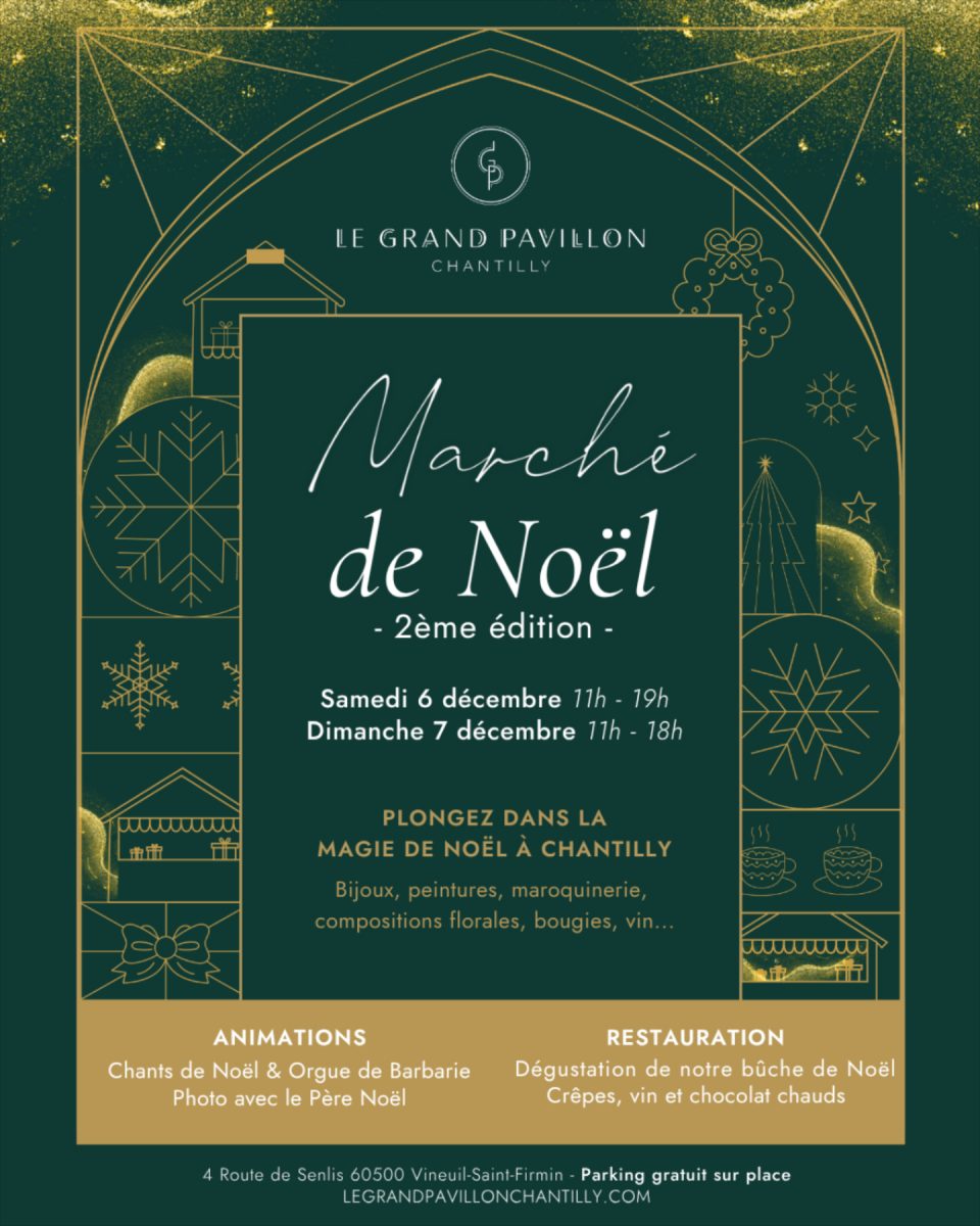 Le Grand Pavillon Chantilly s’illumine pour Noël ! Après le succès de notre première édition, nous avons le plaisir de vous annoncer le retour de notre Marché de Noël 2025. Un rendez-vous féerique au cœur de Chantilly pour célébrer la magie des fêtes en famille ou entre amis !