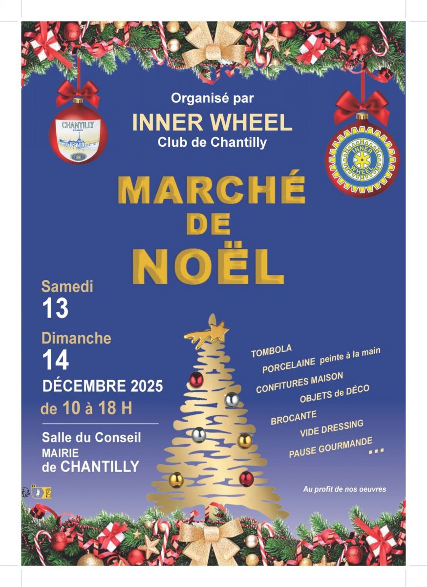 Le club Inner Wheel de Chantilly organise son traditionnel marché de Noël, au profit de bonnes œuvres. Vous pourrez y trouver des objets de décoration de Noël et plein d’idées cadeaux pour se faire plaisir ou pour offrir, tout en faisant une
