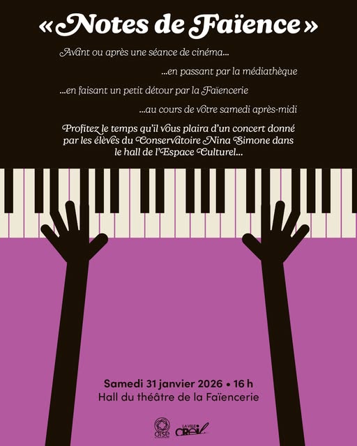 Avant ou après une séance de cinéma, en passant par la médiathèque ou lors d’un détour à la Faïencerie, profitez librement d’un concert interprété par les élèves du Conservatoire Nina Simone, samedi 31 janvier à 16h dans le hall de la Faïencerie.