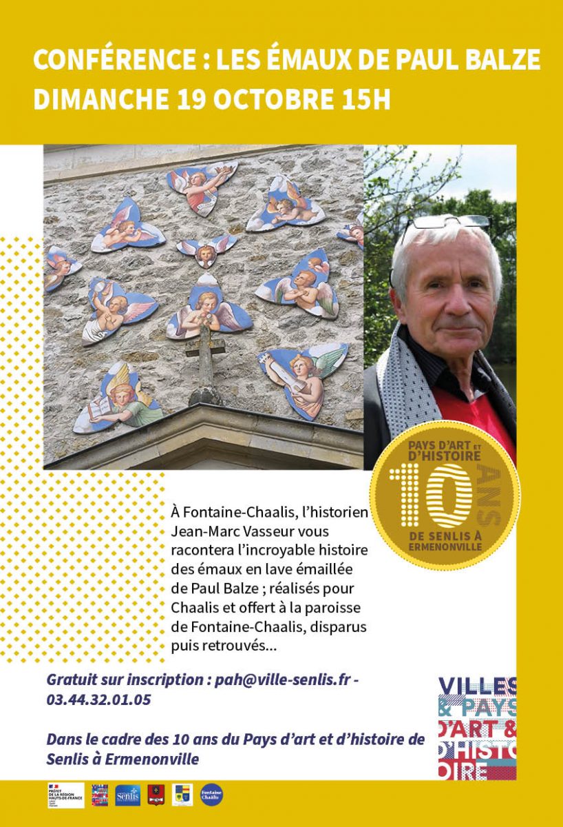 En 1878, le peintre Paul Balze réalise de nombreux émaux sur lave pour la chapelle de Chaalis. Déposés par Nélie Jacquemart-André et offert à la paroisse de Fontaine-Chaalis, les émaux disparurent plusieurs décennies avant d’être retrouvés… C’est cette incroyable histoire que Jean-Marc Vasseur, historien et ancien responsable du service culturel et pédagogique de l’abbaye de Chaalis vous racontera au travers d’une conférence in situ.