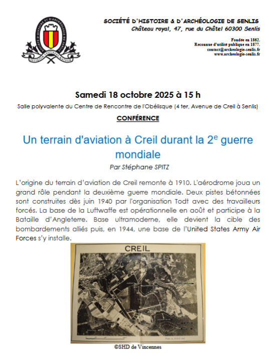 De septembre à juin, la Société d’histoire et d’archéologie de Senlis propose un cycle de conférences, le 3e samedi de chaque mois, approfondissant une thématique et faisant intervenir des historiens et spécialistes. En octobre, la conférence donnée par Stéphane Spitz portera sur le rôle de l’aérodrome de Creil durant la deuxième Guerre mondiale.